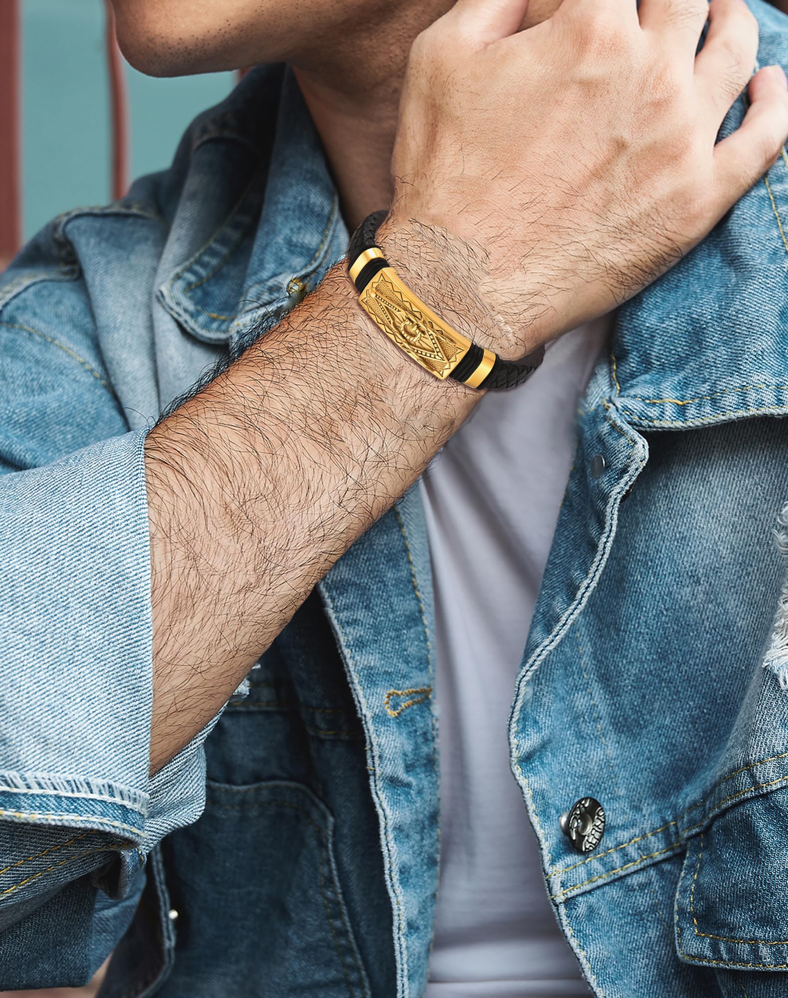 - Stunning Design: YL masonic black leather bracelet for men are made of hand-braided by skilled artisans, 18k gold plated 316L stainless steel, upgrade buckle clasp, easy close and open